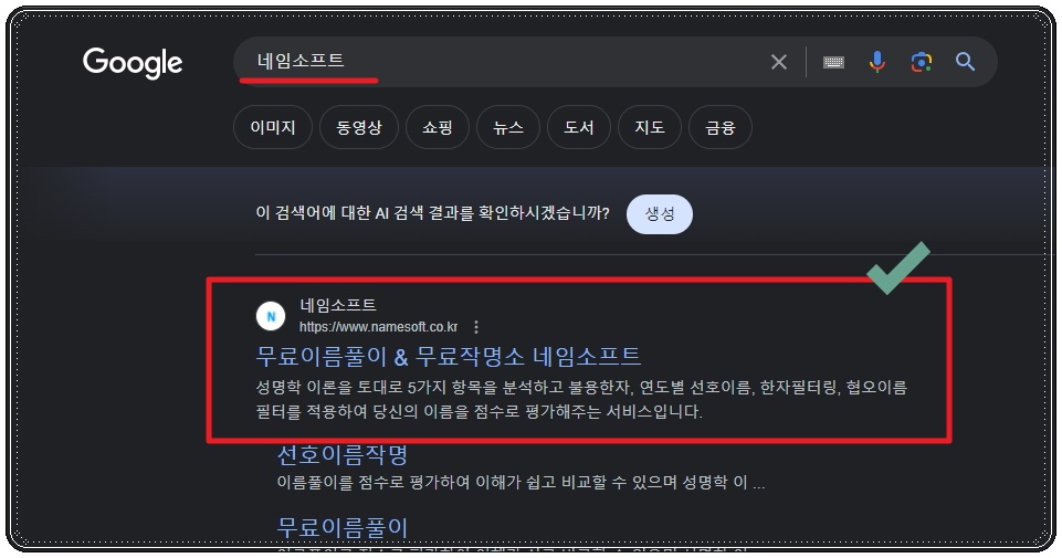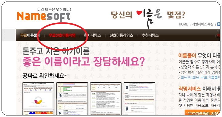 앞서 살펴본 것은 간단한 보기일 뿐이고, 본격적으로 300개의 여자 이름 추천을 받는 것에 대해 알려드리겠습니다. 네임소프트 사이트를 이용하면 되는데요. 간단한 검색을 통해 네임소프트 공식 홈페이지에 접속해 주세요.