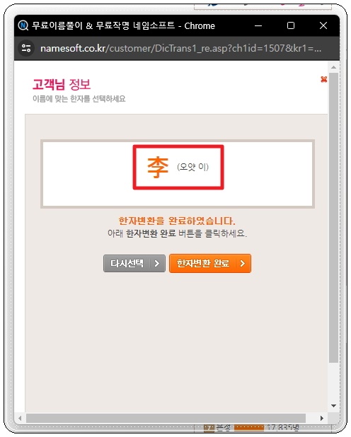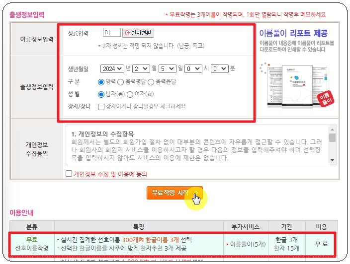 사람마다 자신에게 맞는 이름이 있습니다. 그렇기 때문에 성씨와 출생정보를 입력할 필요가 있어요. 그래야 이에 맞는 여자 이름을 추천해주기 때문인데요. 성별에서는 여자를 선택해야 합니다. 화면 하단에 보면 이용안내 문구가 있는데요. 앞서 말씀드린 바와 같이 300개의 한글이름을 얻을 수 있습니다. 추가로 한자도 얻을 수 있는데요. 이에 대해서도 자세하게 설명드리도록 하겠습니다. 성씨의 경우에는 한자까지 입력해야 해요. 이곳에서 제공하는 한자변환 기능을 사용하면 됩니다.