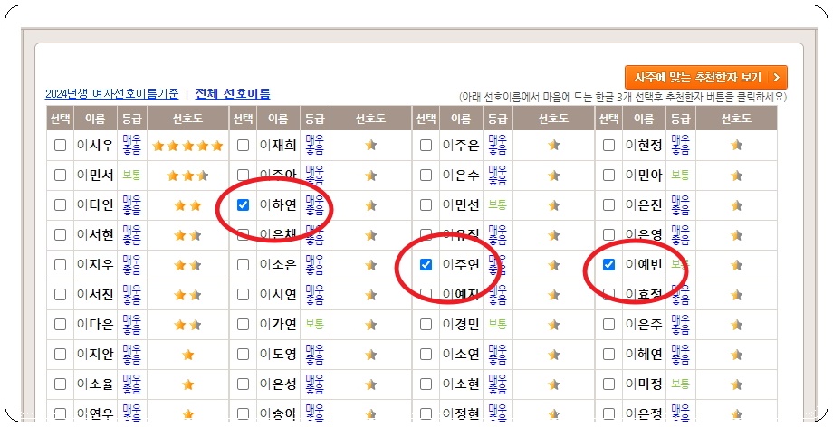 새롭게 페이지가 열리면서 300개의 여자 이름이 나타났습니다. 대부분 성명학 이론에 따라 좋은 평가를 받는 것들인데요. 여기에서 추천한 것 중에서 마음에 드는 것을 3가지 선택해 보세요. 그럼 한자를 받아볼 수 있어요. 3가지를 선택한 후 우측 상단에 있는 [사주에 맞는 추천한자 보기] 버튼을 클릭합니다.