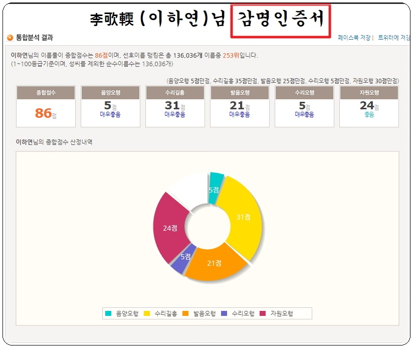 그럼 이렇게 감명인증서가 나타납니다. 트위터와 페이스북으로 저장이 가능한데요. 다른 사람들에게 공유하여 괜찮은지 서로 상의하면 좋아요. 종합점수와 랭킹도 확인할 수 있고, 앞서 언급한 성명학 이론에 따라 어느 정도 좋은지도 감명인증서에 상세하게 표시되어 있습니다.