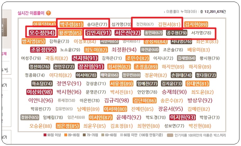 불특정 다수의 이름에 대한 점수를 확인할 수 있는 표를 살펴보겠습니다. 성명학 이론에 따른 종합점수인데요. 100점에 가까울수록 좋은 평가를 받은 것입니다. 이를 통해 어떤 성명이 유행인지 그리고 성명학 이론에 따라 얼마나 좋은지 확인이 가능해요.