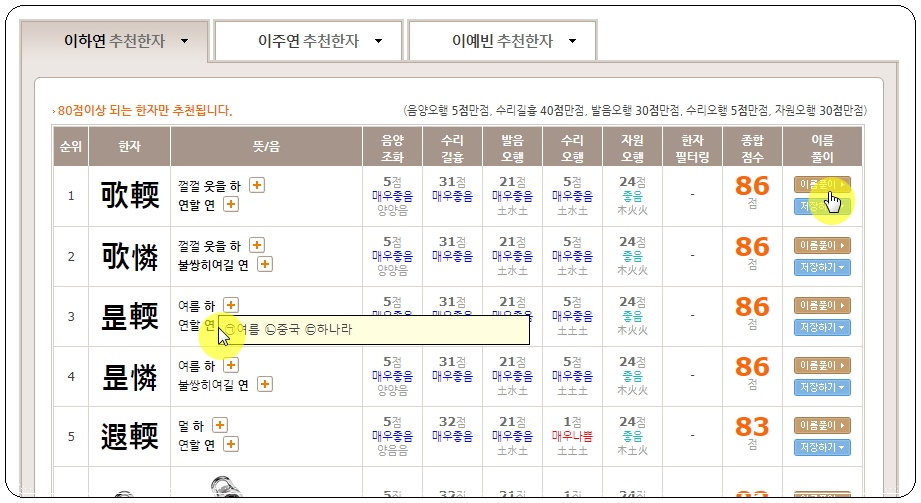 제가 선택한 "이하연, 이주연, 이예빈"에 어울리는 한자를 각각 5개씩 추천 받았습니다. 성명학 이론에 속하는 음양조화, 수리길흉, 발음오행, 수리오행, 자원오행 이렇게 5가지 기준에 따라 좋은 평가를 받고 있는데요. 우리 같이 잘 모르는 사람들은 종합점수만 보면 됩니다. 추천 받은 한자에서 한 가지를 선택한 후 [이름 풀이] 버튼을 클릭해 보세요.