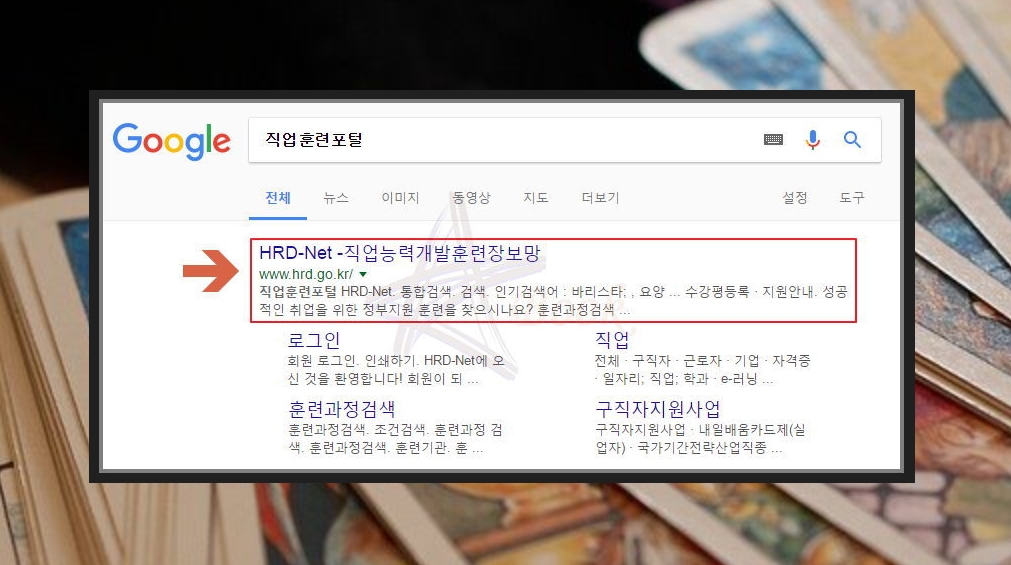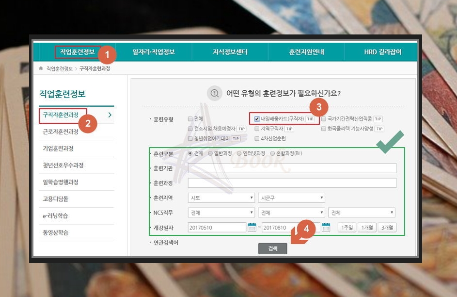 고용노동부에서 운영하는 HRD-NET에 접속해서 '직업훈련정보 ▷ 구직자훈련과정'을 차례로 클릭해주세요. 그럼 배울수 있는 훈련과정을 검색해볼 수 있는데요. 내일배움카드로 배울수 있는 모든 과정을 확인하고 싶다면 훈련유형을 '내일배움카드(구직자)'로 지정한 후 검색하면 됩니다.