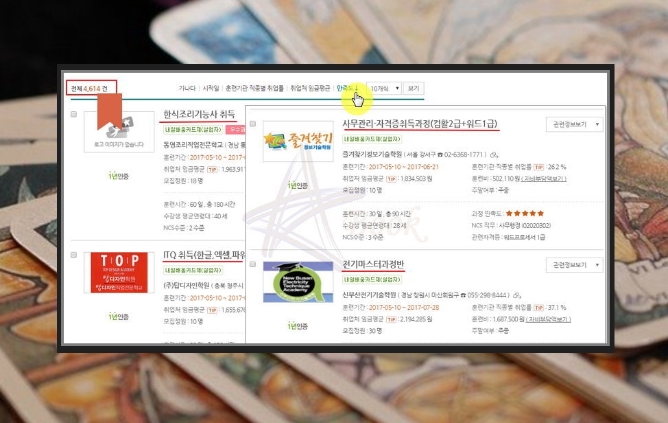 오늘은 내일배움카드로 배울수 있는것에 대해 알아보았는데요. 마지막에 검색할 때 취업률, 임금평균, 만족도를 기준으로 정렬할 수 있습니다. 정렬기능과 함께 '자비부담액보기'를 참고하여 본인에게 맞는 훈련을 찾아보세요.