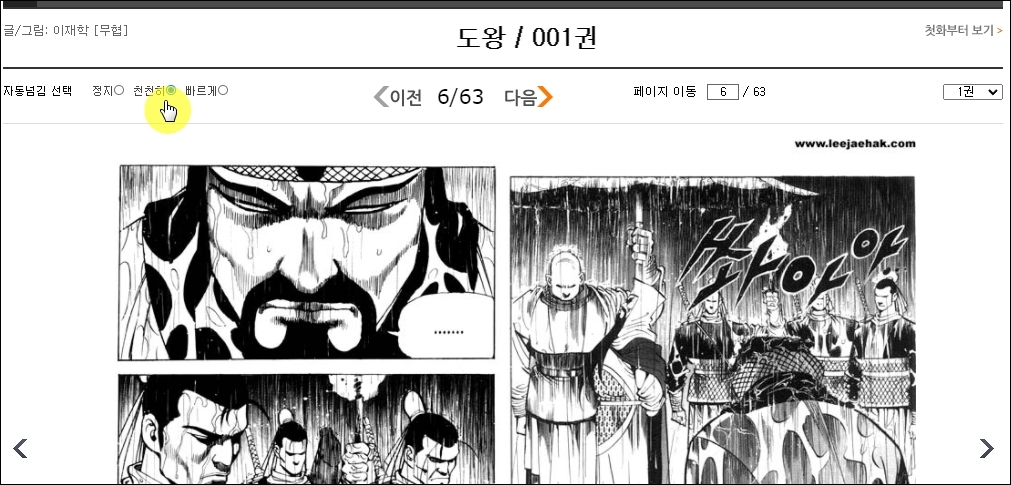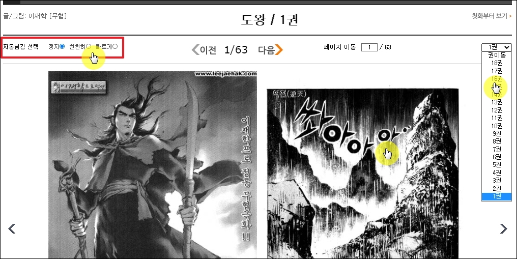 ▼보고 싶은 작품의 제목이나 썸네일을 클릭해 봅니다. 그럼 바로 무료만화 감상을 할 수 있습니다. 한 화면을 통해 2페이지씩 감상이 가능합니다. 다 보고 난 후에는 오른쪽에 있는 페이지를 마우스로 클릭하면 다음 페이지로 넘길 수 있습니다. 감상 화면을 보면 좌측 상단에 자동넘김 선택 기능이 있습니다. 해당 기능을 사용하면 마우스 클릭 없이 자동으로 페이지를 넘길 수 있습니다. 반대쪽에는 권이동을 할 수 있는 셀렉트 박스가 마련되어 있으니 참고하시길 바랍니다.