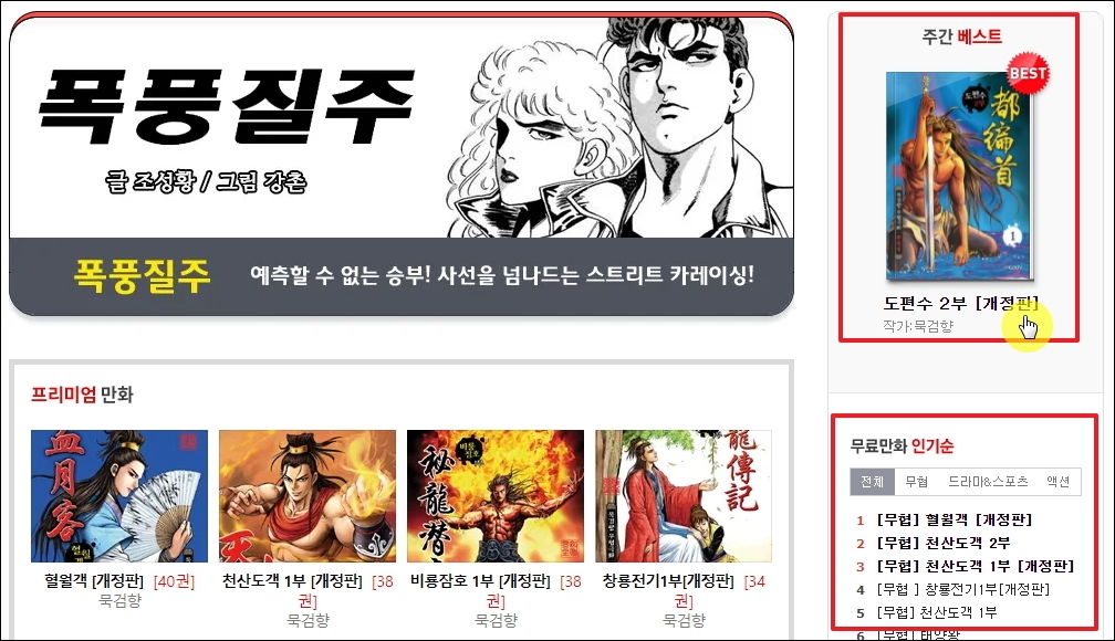▼이곳에서는 요즘 혈월객, 도편수, 천산도격, 창룡전기, 천산도객의 인기가 높습니다. 무협, 드라마, 스포츠, 액션 이렇게 4가지 장르 위주로 만화 작품을 만나볼 수 있는 곳입니다.
