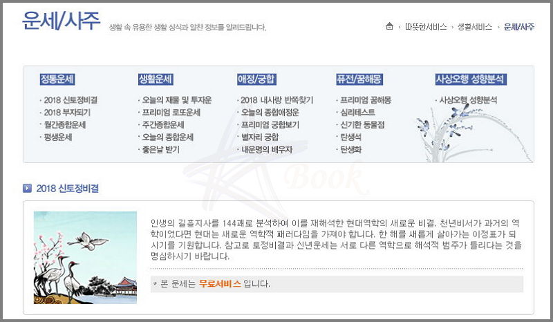 국내에서 인터넷으로 사주팔자를 보는 것을 즐기는 사람이면 이곳을 모르는 사람이 거의 없을 정도로 유명한 사이트입니다. 무료서비스로 제공되는 것이기 때문에 부담이 없고, 완성도가 높아 전문성이 돋보이는 곳입니다. 금융 관련 사이트 답게 재물, 투자운, 로또운세와 같이 돈에 관련된 운세 서비스도 제공하고 있으니 관심이 있는 분들은 함께 이용하시길 바랍니다.