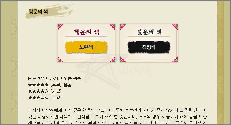 운신의 또 다른 특징은 행운의 색과 숫자입니다. 사람마다 자신에게 어울리는 색이 있듯이 행운을 가져다 주는 색이 있습니다. 부부간의 금술을 좋게 한다거나 사업이 번창하게 하기 위해 인테리어나 옷의 색을 어떻게 해야 하는지 알려줍니다. 색을 결정하기 어려운 경우에 참고하시면 좋습니다.