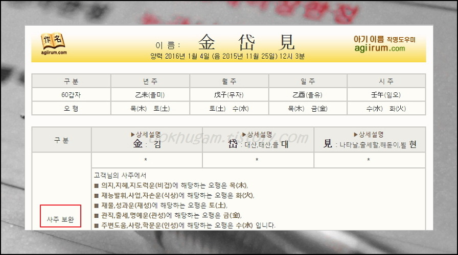 신생아 이름짓기를 완료했습니다. 그럼 이에 대한 풀이 결과를 볼 수 있는데요. 사주보완, 소리파동(음오행, 소리오행), 음양의 조화, 수리오행(삼원오행), 수리격, 주역(사주고려) 등을 기준으로 평가 및 풀이를 해준답니다. 마음에 드는 신생아 이름이 있다면 확인해보세요.