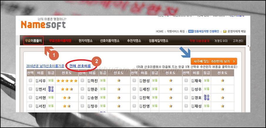 Namesoft로 검색하면 쉽게 접속하실 수 있는데요. 여기도 무료로 이용할 수 있으나 1회만 가능하답니다. 그렇기 때문에 중요한 부분은 직접 메모를 하면서 보시는 것이 좋은데요. 이곳에서 신생아 이름 순위도 확인할 수 있답니다. 여기서 마음에 드는 성명 3가지를 선택한 다음에 사주에 맞는 "추천한자 보기"를 눌러보세요.