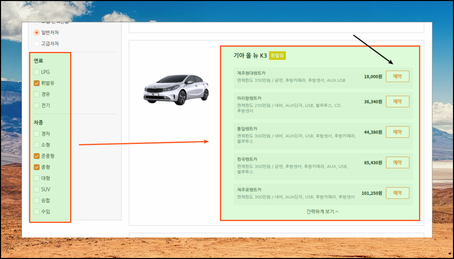 그럼 제가 원하는 기준으로 좌측에서 설정을 해보았어요. 휘발유가 들어가는 준중형 또는 중형 모델인데요. 기아 올 뉴 K3가 검색이 되었네요. 면책한도가 350만원이고, 후방카메라와 후방센서가 있음에도 18,000원으로 싼곳이 보이네요. 비싼곳과 비교했을 때 5분의 1 가격으로 꽤 저렴해요.