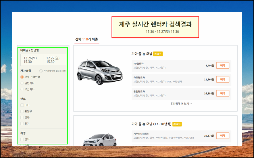 지금은 정보화 시대에요. 남들보다 중요한 정보를 빠르게 얻을수록 이익이 되죠. 제주도 렌트카 업체나 서비스를 실시간으로 비교할 수 있는 사이트가 있어요. 차종이 110개나 되기 때문에 원하는 차량으로 비교해 볼 수 있죠. 기아 올 뉴 모닝 기준으로 제주도에서 1일 동안 발생하는 이용료가 가장 싼곳의 경우 8,400원이네요.