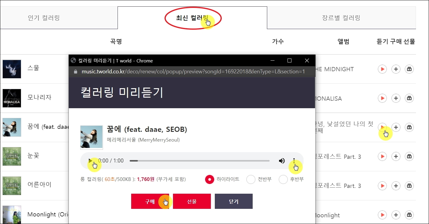 ▼해당 페이지에서 간단하게 컬러링 음원 바꾸는법을 알려드리겠습니다. 리스트에서 듣기 버튼을 누르면 [컬러링 미리듣기] 창이 열립니다. 여기에서 재생 버튼을 눌러 음원을 감상해 봅니다. 하이라이트, 전반부, 후반부 3가지 버전이 있으니 모두 들어보고, 어떤 것을 선택할 것인지 결정합니다. 그 다음 마음에 들면 [구매] 버튼을 누르면 됩니다. 이후 비용을 결제를 하고, 안내에 따라 설정을 진행하면 됩니다.