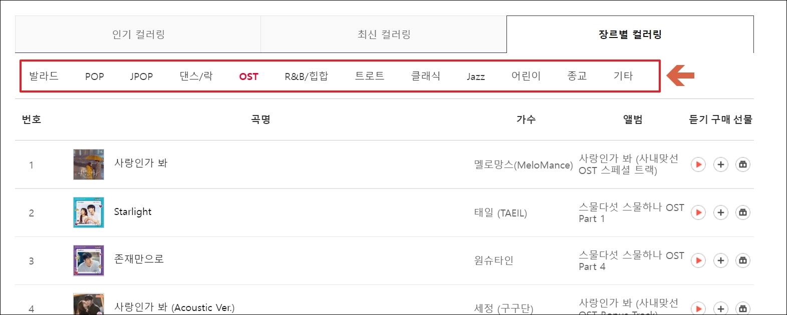 ▼사람마다 좋아하는 장르가 다릅니다. 장르별 컬러링 메뉴를 선택하면 각 장르별 인기 음원 순위를 확인할 수 있습니다. 발라드, 클래식, 종료, 어린이, 댄스, 락 등 정말 다양한 장르를 다루고 있습니다.