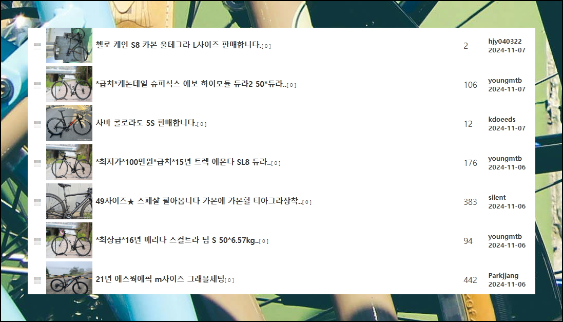 직거래장터 사이트를 통해 매일 새로운 매물이 쏟아지는 활발한 거래 현장을 만나보실 수 있어요. 산악용부터 로드바이크, 전기자전거까지 각각의 전문 게시판이 따로 마련되어 있어 원하는 제품을 쉽게 찾아볼 수 있습니다. 전문성 있는 판매자들이 많아 제품 상태나 스펙에 대한 상세한 설명을 기대할 수 있어요.