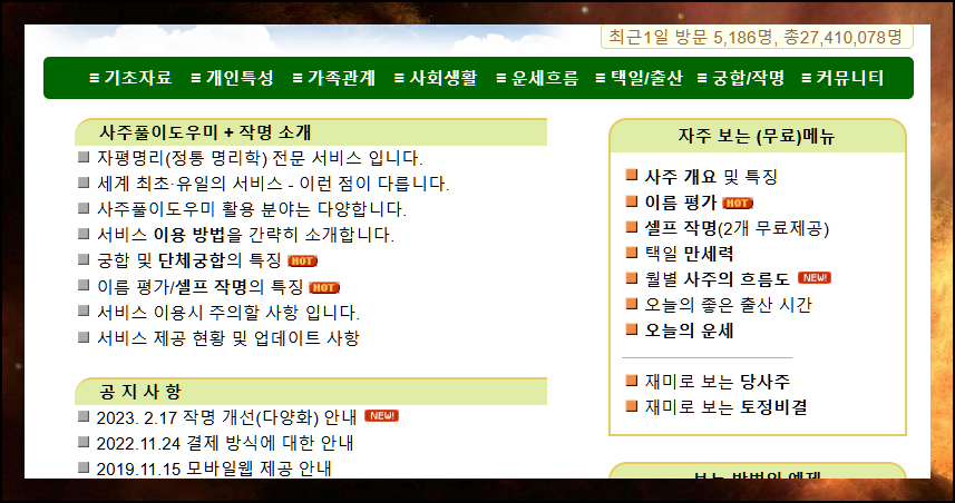 우측 상단에서 사주풀이도우미의 무료 서비스들을 찾아볼 수 있어요. 기본적인 특징 분석부터 이름 관련 서비스, 일간 또는 월별 운세 정보까지 무료로 제공됩니다. 특히 토정비결과 당사주는 상세하고 전문적인 해석을 제공하니 꼭 확인해 보세요.