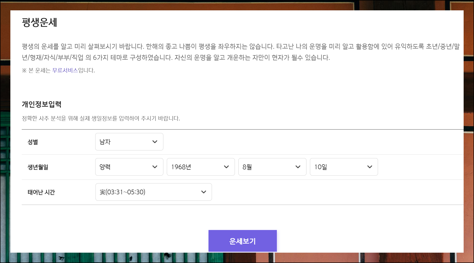 무료 사주 사이트의 평생운세 서비스는 무료로 이용이 가능합니다. 정확한 결과를 위해 성별과 생년월일시를 입력하면 바로 확인할 수 있어요. 입력한 정보는 철저히 보호됩니다.