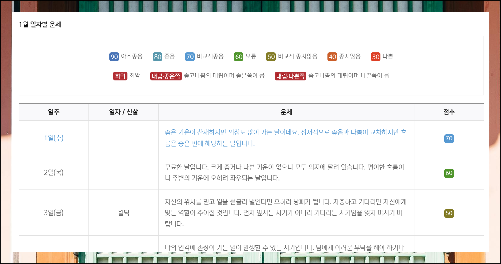 매일의 운세를 점수로 확인할 수 있어 한눈에 보기 좋습니다. 100점 만점으로 평가되어 이해하기 쉽죠.