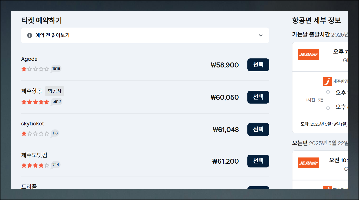 출발 시각까지 결정했다면 이제 예약할 항공사나 여행사를 고를 차례입니다. 요금, 서비스, 평판 등을 고려해 자신에게 맞는 업체를 선택해보세요. 제주도 여행의 시작은 항공권 예약부터입니다.