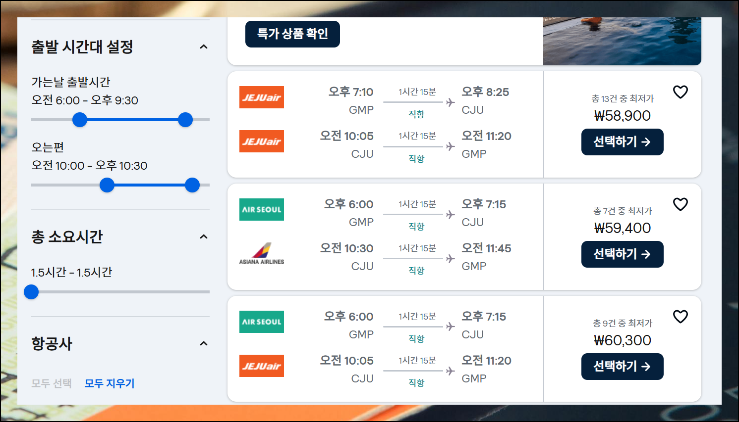 화면 좌측의 출발 시간대 필터를 조정하면 더욱 효과적으로 검색할 수 있어요. 이 기능을 활용하면 수많은 비행편 중에서 나에게 가장 적합한 제주도 왕복 노선을 쉽게 찾을 수 있습니다.