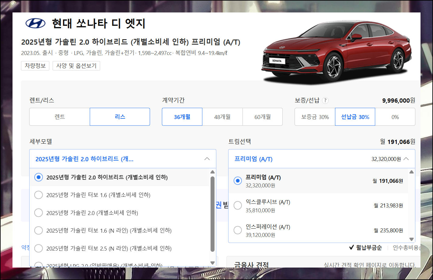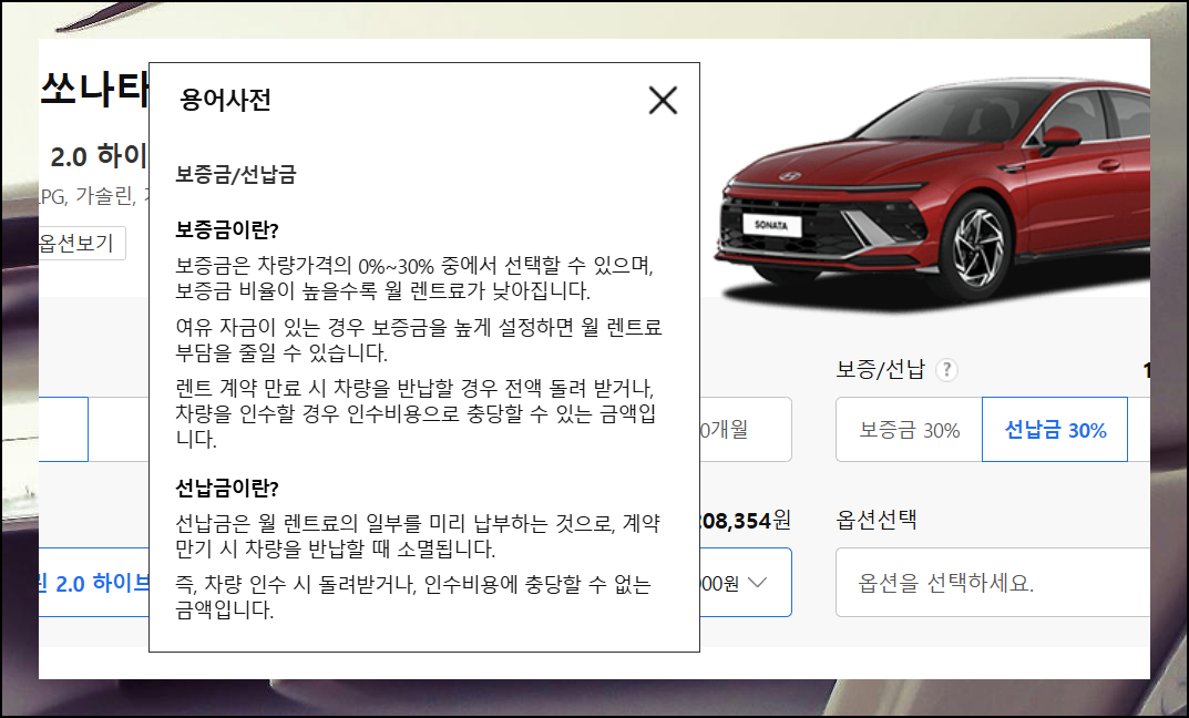 추가 선택 페이지에서는 더 세밀한 조건 설정이 가능해요. 같은 모델이라도 세부 등급에 따라 가격표 수치가 크게 달라질 수 있습니다. 이용기간, 보증금, 선납금, 세부 등급 등을 다양하게 조절해보면서 내 상황에 가장 적합한 옵션을 찾아보세요.