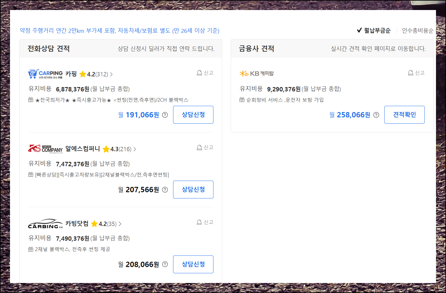 조건 설정이 끝났다면 리스 견적표 아래에 있는 업체 목록도 꼭 확인하세요. 각 회사마다 제시하는 월 비용과 혜택이 다를 수 있어요. 상담 신청도 간편하게 할 수 있어 궁금한 점을 바로 물어볼 수 있답니다.
