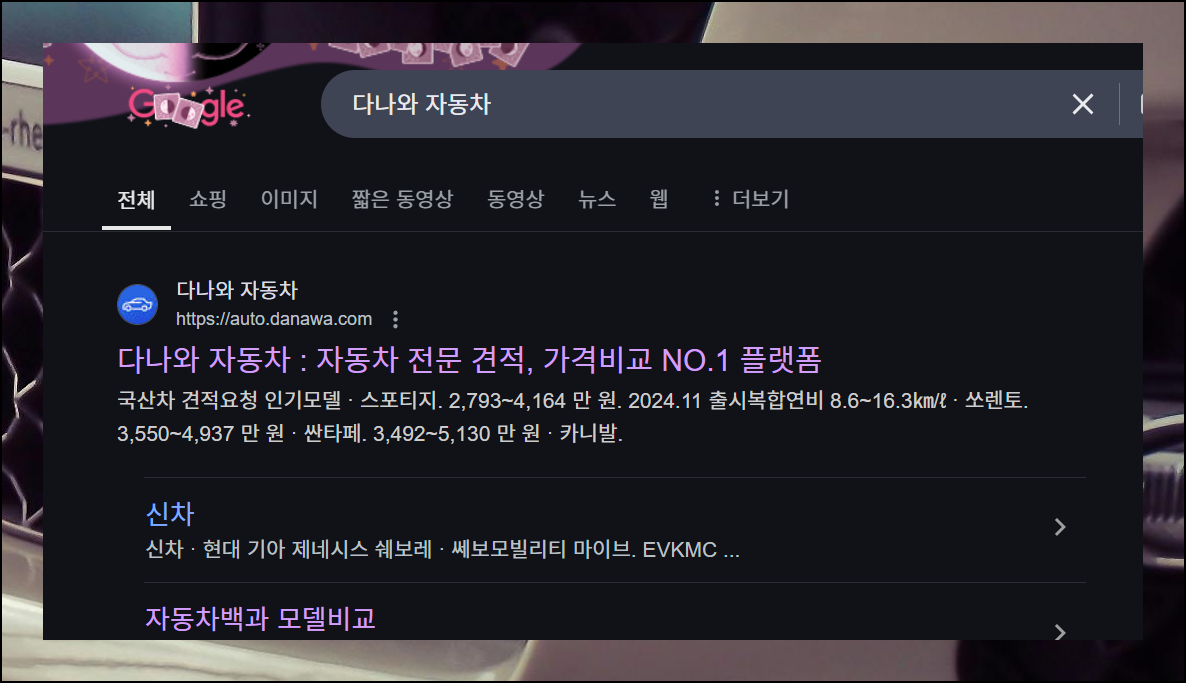 다나와 자동차 사이트에 들어가서 [리스]와 [가격비교] 메뉴를 선택하면 됩니다. 이곳에서는 리스 서비스뿐만 아니라 신차, 중고차, 렌트 가격표까지 한 곳에서 모두 확인할 수 있어요.