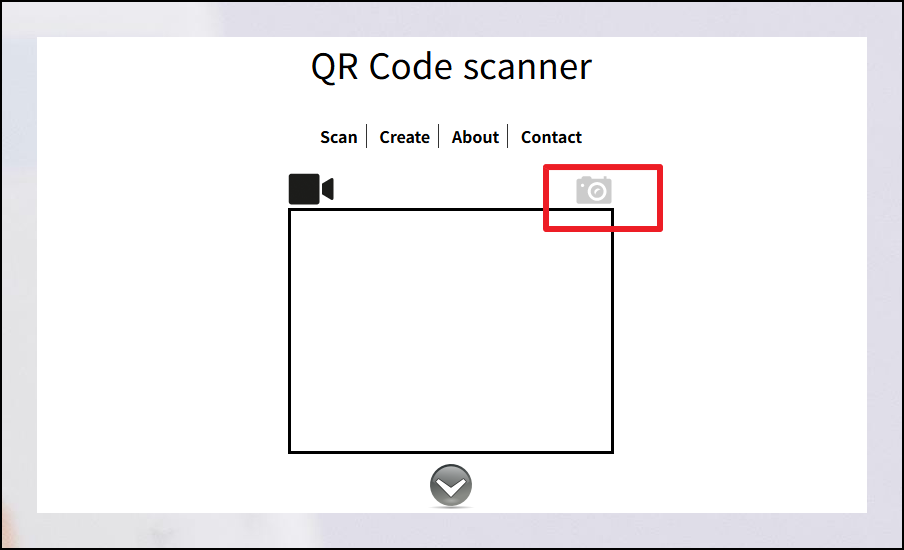 QR Code scanner 사이트에서 카메라 아이콘을 클릭하면 "drag and drop a QRCode here or select a file" 메시지가 표시됩니다.