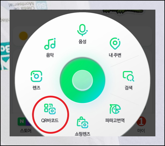네이버 앱을 실행하면 검색창 옆에 녹색 둥근 버튼이 있습니다. 이 버튼을 누르면 다양한 메뉴가 나타나는데, 여기서 "QR/바코드" 항목을 선택하세요.