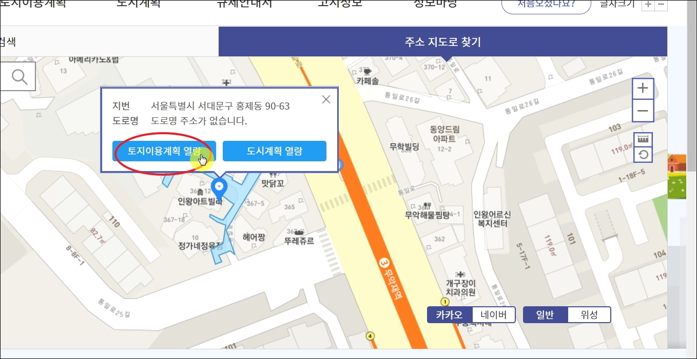 ▼[주소 지소로 찾기] 메뉴를 선택하면 다음과 같은 지도 화면이 나타납니다. 여기에서 특정 지역을 찾은 다음에 마우스 휠을 돌려 화면을 확대합니다. 휠이 없는 마우스를 사용하는 경우라면 지도 화면 우측에 있는 [플러스] 모양의 버튼을 눌러 확대를 할 수 있습니다. 그 다음 알아보고 싶은 지역을 마우스로 클릭합니다. 그럼 [토지이용계획 열람]과 [도시계획 열람] 버튼이 나타납니다. 여기서 전자를 선택합니다.