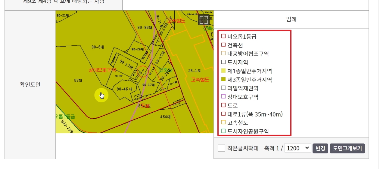 ▼다음은 확인도면을 살펴보겠습니다. 건축선, 과밀억제권역, 상대보호구역, 도로, 고속철도 등 범례를 참고하여 도면을 살펴보면 됩니다. 여기에서 유용한 기능이 있는데, 확인도면을 마우스로 클릭하면 해당 기능을 사용할 수 있습니다.