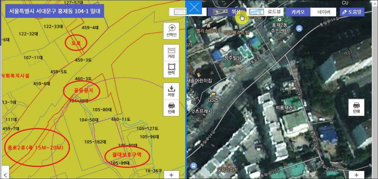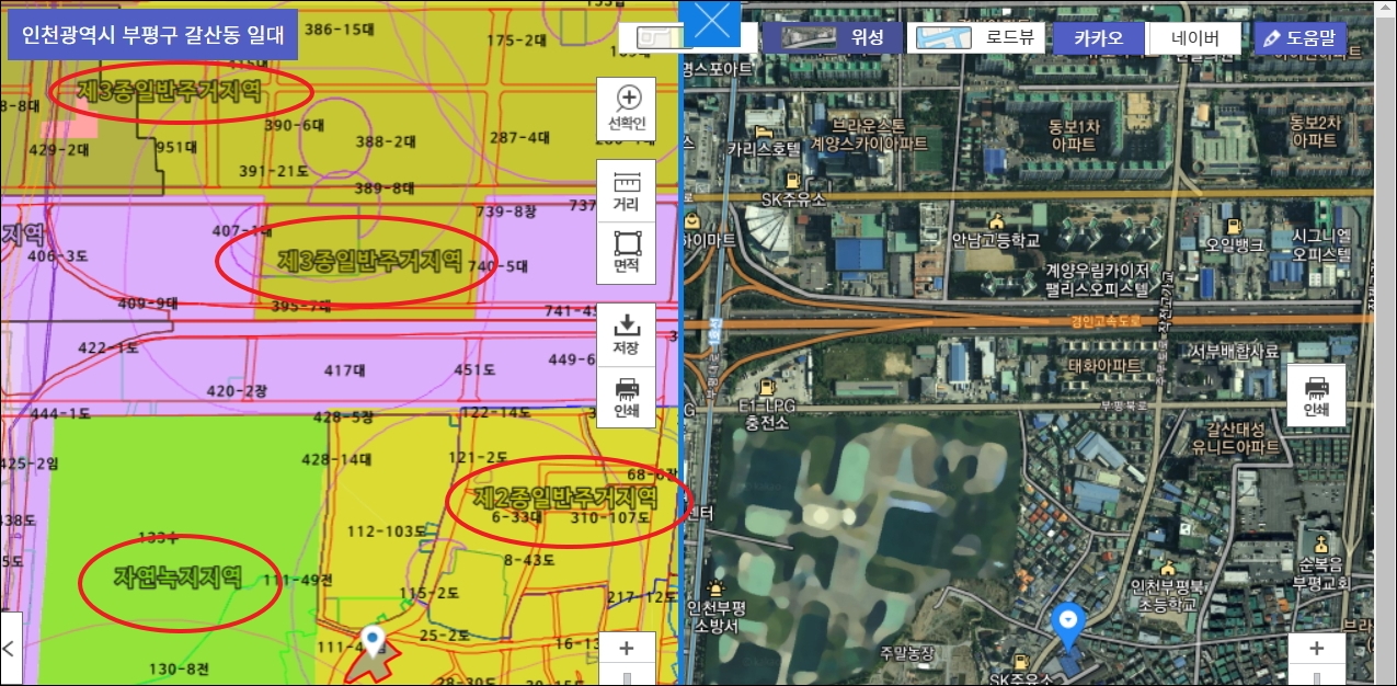 ▼요즘에는 컴퓨터 관련 기술이 발전하여 다음과 같이 지적도와 위성 지도를 함께 볼 수 있는 서비스가 추가되었습니다. 이를 통해 어떤 지역이 어떤 지역지구로 지정이 되었는지 알아보면서 실제 동네 모습을 확인할 수 있습니다. 이것 또한 토지이용계획확인원 열람을 통해 이용 가능한 서비스입니다.