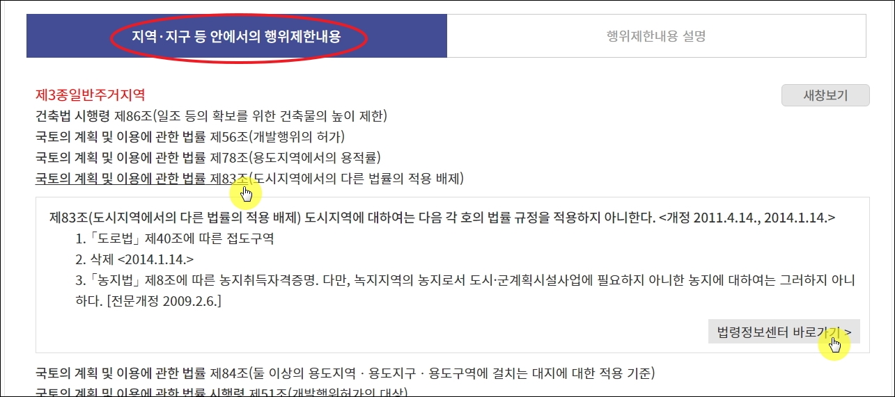 ▼토지이용계획확인원에서 가장 마지막 내용은 지역 및 지구 등 안에서의 행위제한내용입니다. 각 조항을 클릭하면 상세 내용을 확인할 수 있도록 되어 있습니다. 더 자세하게 보고 싶을 때에는 [법령정보센터 바로가기] 버튼을 클릭하면 됩니다.