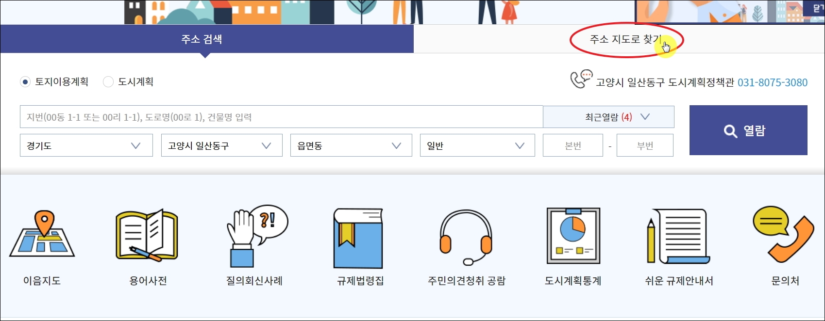 ▼메인화면에서 토지이용계획확인원을 살펴보고 싶은 지역의 주소를 정확하게 입력한 후 [열람] 버튼을 누릅니다. 주소를 모르는 경우에는 [주소 지도로 찾기] 메뉴를 선택합니다. 참고로 이곳에서는 용어사전, 규제법령집, 도시계획통계, 쉬운 규제안내서 등 토지이용계획에 관련된 정보나 안내 서비스를 제공하고 있습니다. 주소 검색에서 하단 부분에 해당 서비스 메뉴가 마련되어 있습니다.