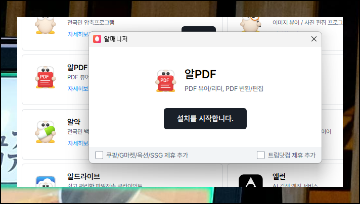 알매니저 창에서 [설치를 시작합니다] 버튼을 누를 때 주의하세요. 좌우측 하단의 체크박스는 제휴 프로그램과 검색엔진 설치 옵션입니다.