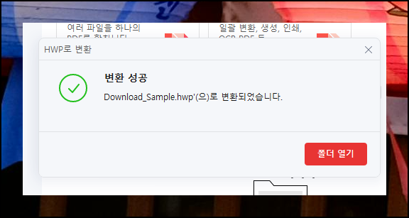 파일 선택 후 확인 버튼을 누르면 "HWP로 변환" 창이 나타나며 작업 완료를 알려줍니다. [열기] 버튼으로 즉시 전환된 한글 문서를 확인할 수 있어요.
