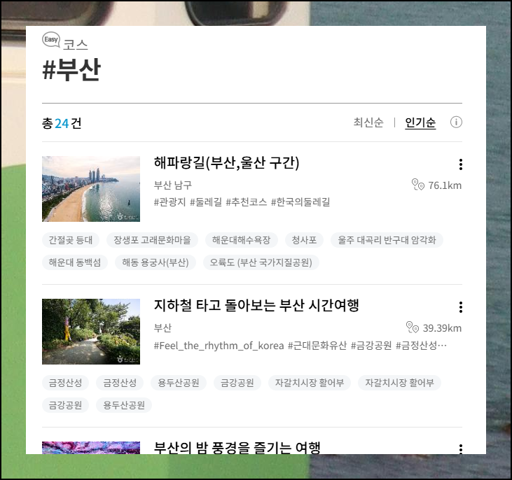 24가지의 특색 있는 코스는 데이트, 자연생태, 영화 테마, 가족 중심 등 다양한 주제로 구성되어 여러분의 선택을 기다리고 있어요. 방문지의 주소, 사진, 상세 설명뿐 아니라 총 거리까지 표시되어 있어 일정 짜기에도 수월합니다.