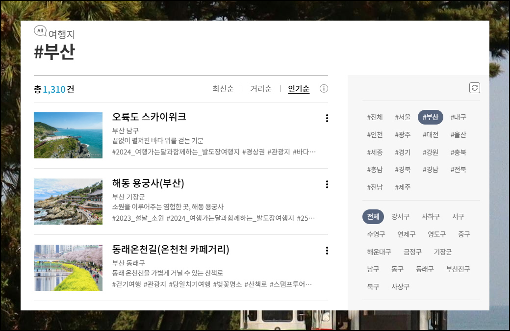 홈페이지 메뉴에서 [인기]를 클릭하면 놀랍게도 1,310건의 추천 방문지를 만나볼 수 있어요. 우측에 있는 태그 기능을 활용하면 여러분의 스타일에 맞는 장소만 골라볼 수 있죠.