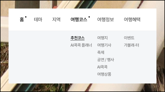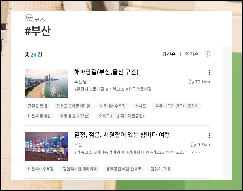 부산 여행 일정과 상세 내용이 궁금하다면 사이트에서 [홈]과 [추천 코스] 메뉴를 선택해보세요. 직관적인 구성으로 처음 방문하시는 분들도 쉽게 내용을 찾을 수 있어요.