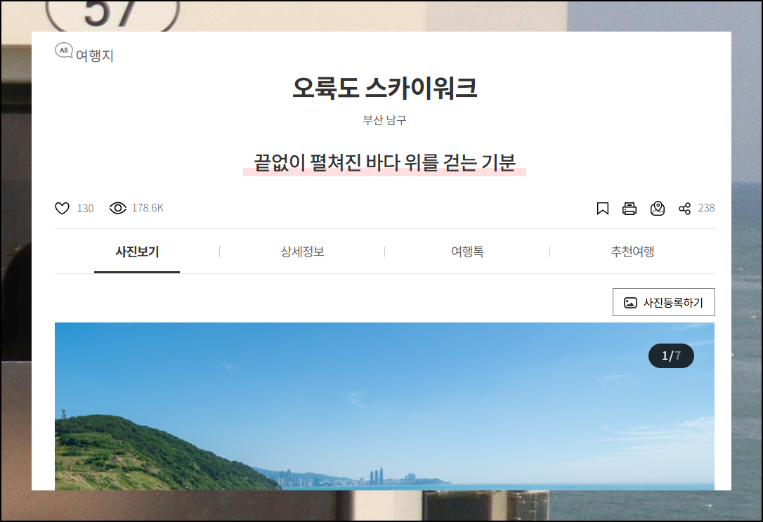 마음에 드는 장소를 선택하면 사진, 세부사항부터 실제 방문객들의 생생한 후기까지 모두 볼 수 있어요. 부산에서 더 많은 가볼만한 곳을 찾고 싶다면 상세 페이지의 [추천] 메뉴를 눌러보세요.