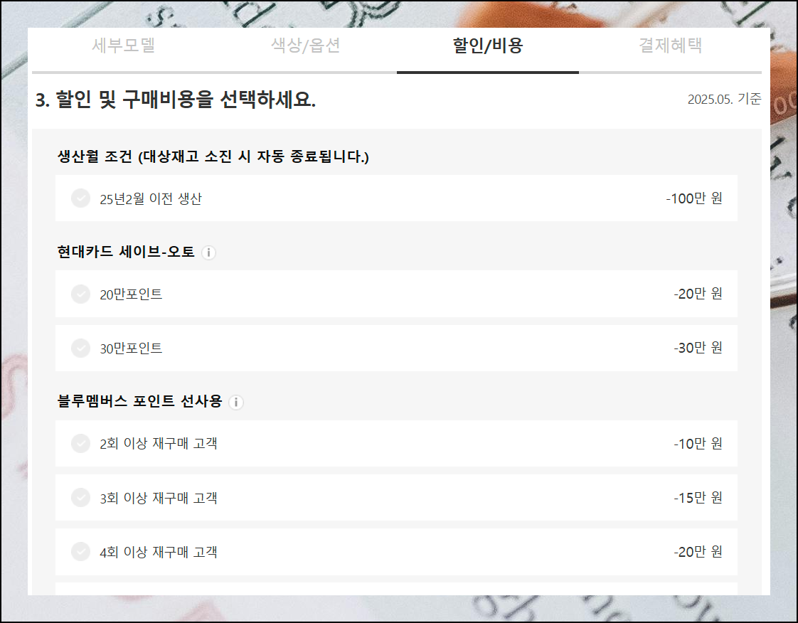 현대자동차는 매월 다양한 할인 판매조건을 제공합니다. 조건을 충족하면 할인 가격표에 표시된 금액만큼 할인 받을 수 있어요.
