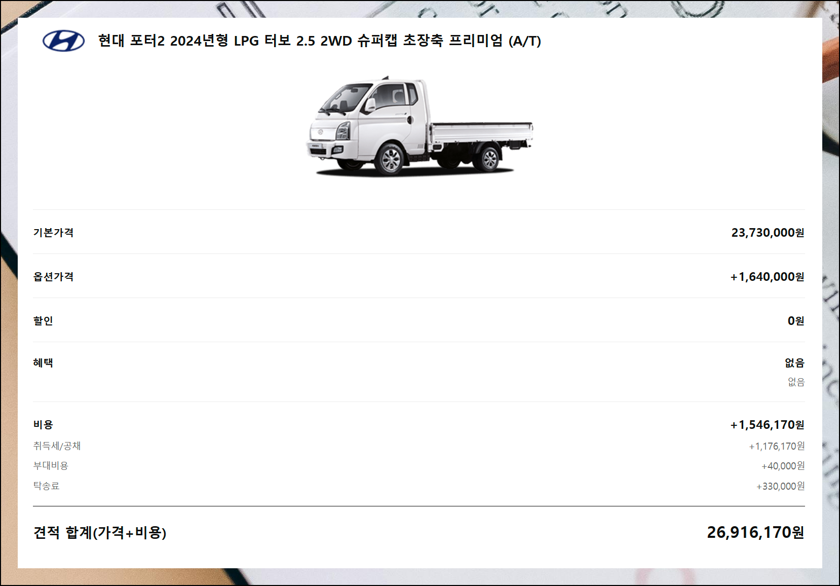 모든 과정을 완료하면 사이트 오른쪽에서 최종 금액과 함께 맞춤형 1톤 트럭 가격표를 확인할 수 있어요. 이렇게 하면 예상치 못한 추가 비용 없이 정확한 구매 예산을 계획할 수 있습니다.