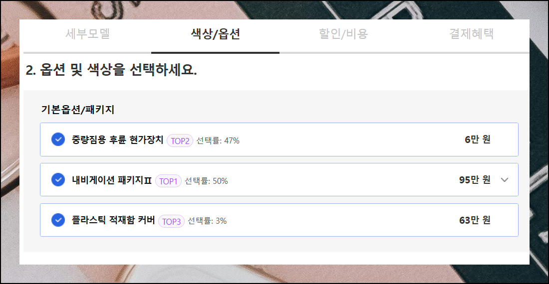 선택한 세부 모델에 따라 이용할 수 있는 추가 요소가 달라질 수 있으니 참고하세요. 업무 효율성을 고려한 옵션 선택으로 불필요한 비용을 줄일 수 있습니다.