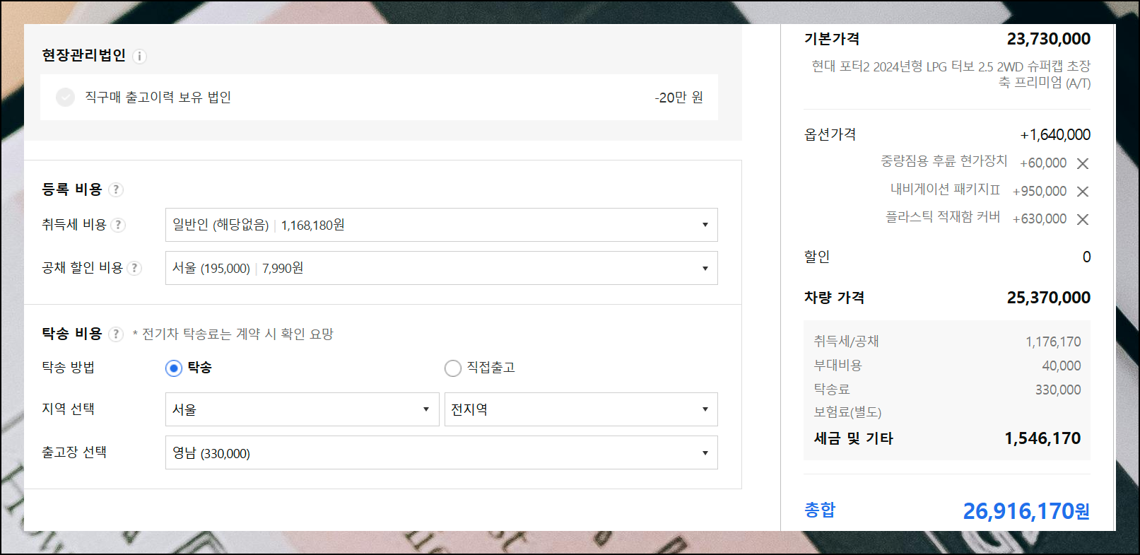 마지막으로 등록 및 탁송 비용 관련 항목을 선택합니다. 거주 지역과 자격 조건에 맞게 선택하면 비용이 자동으로 계산됩니다.