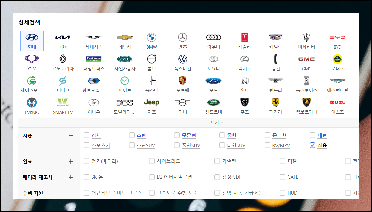1톤 화물차를 찾으려면 차종, 연료타입, 주행 지원기능 등 다양한 조건을 설정할 수 있습니다. 먼저 "상용"을 선택하면 현대의 1톤 화물차량을 포함한 다양한 차종 리스트가 나타나요.