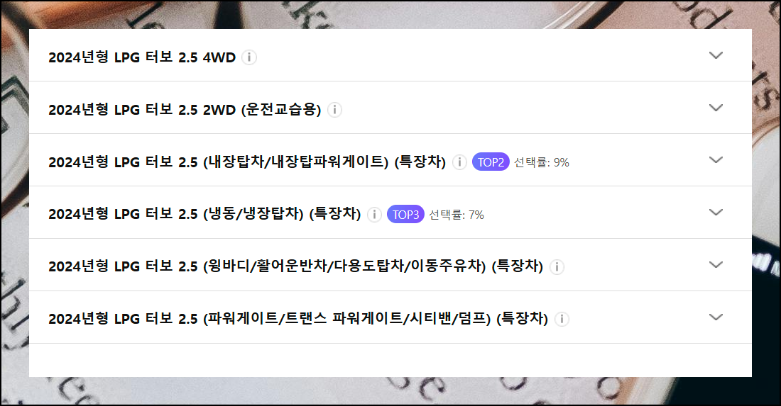 맞춤형 가격표 확인을 위한 첫 단계는 세부 모델 선택입니다. 표시된 선택률을 보면 어떤 1톤 차량이 인기 있는지 알 수 있어요.
