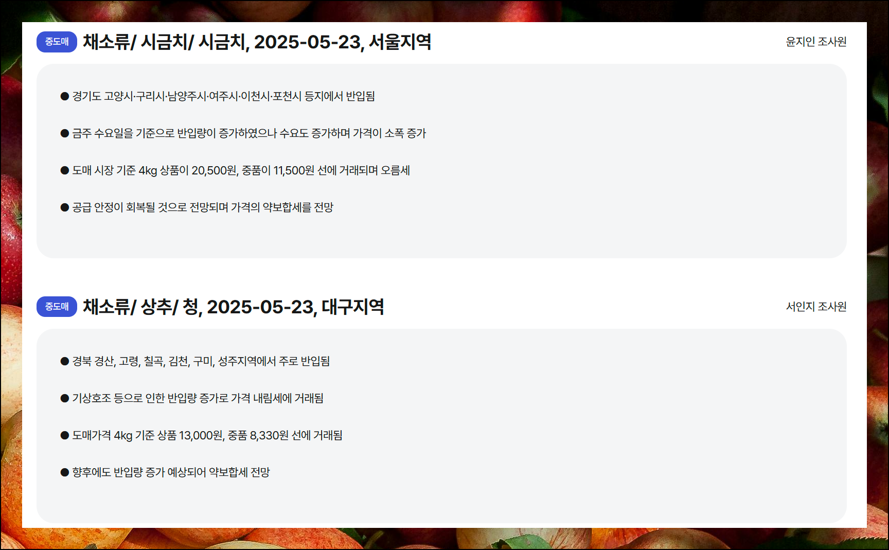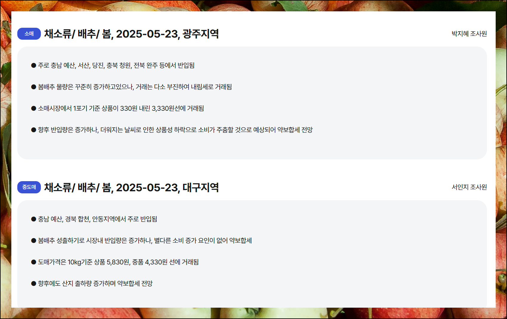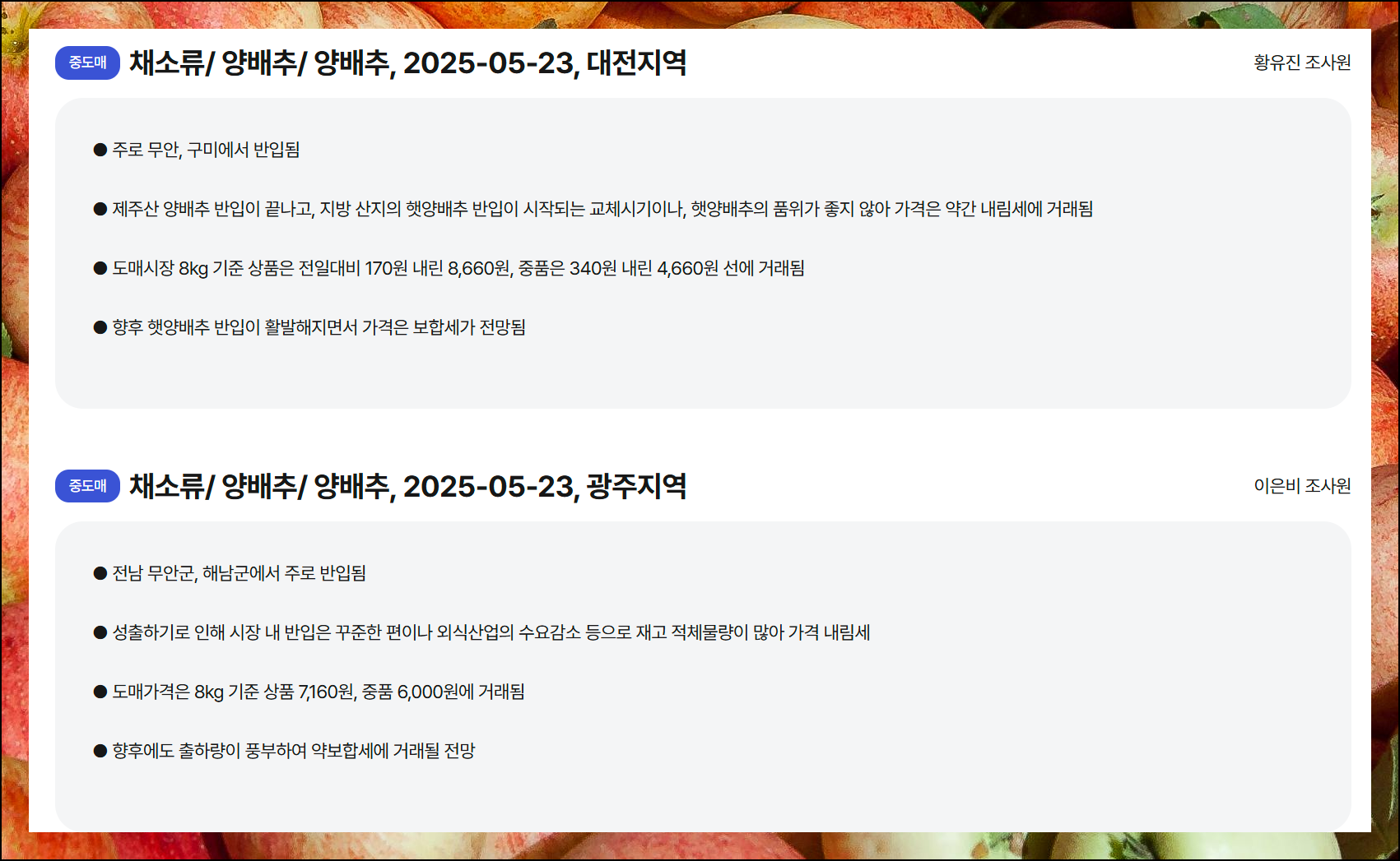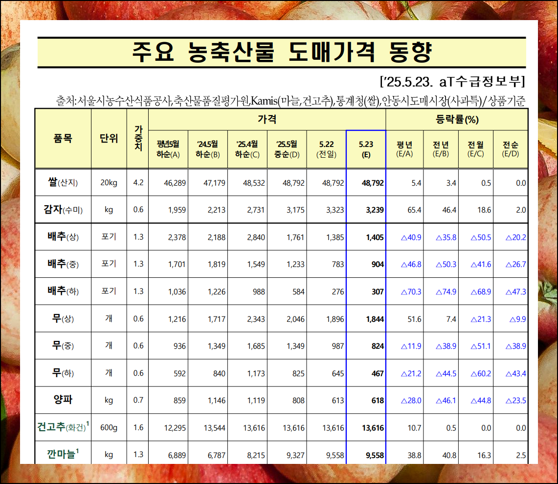 전국 각지의 소매가와 도매가 정보를 통해 서로 비교해보면서 가장 합리적인 구매 시점을 찾아보실 수 있어요. 특히 계절별 시세 변동 패턴까지 파악할 수 있어서 앞으로의 물가 흐름도 예측해보실 수 있습니다.