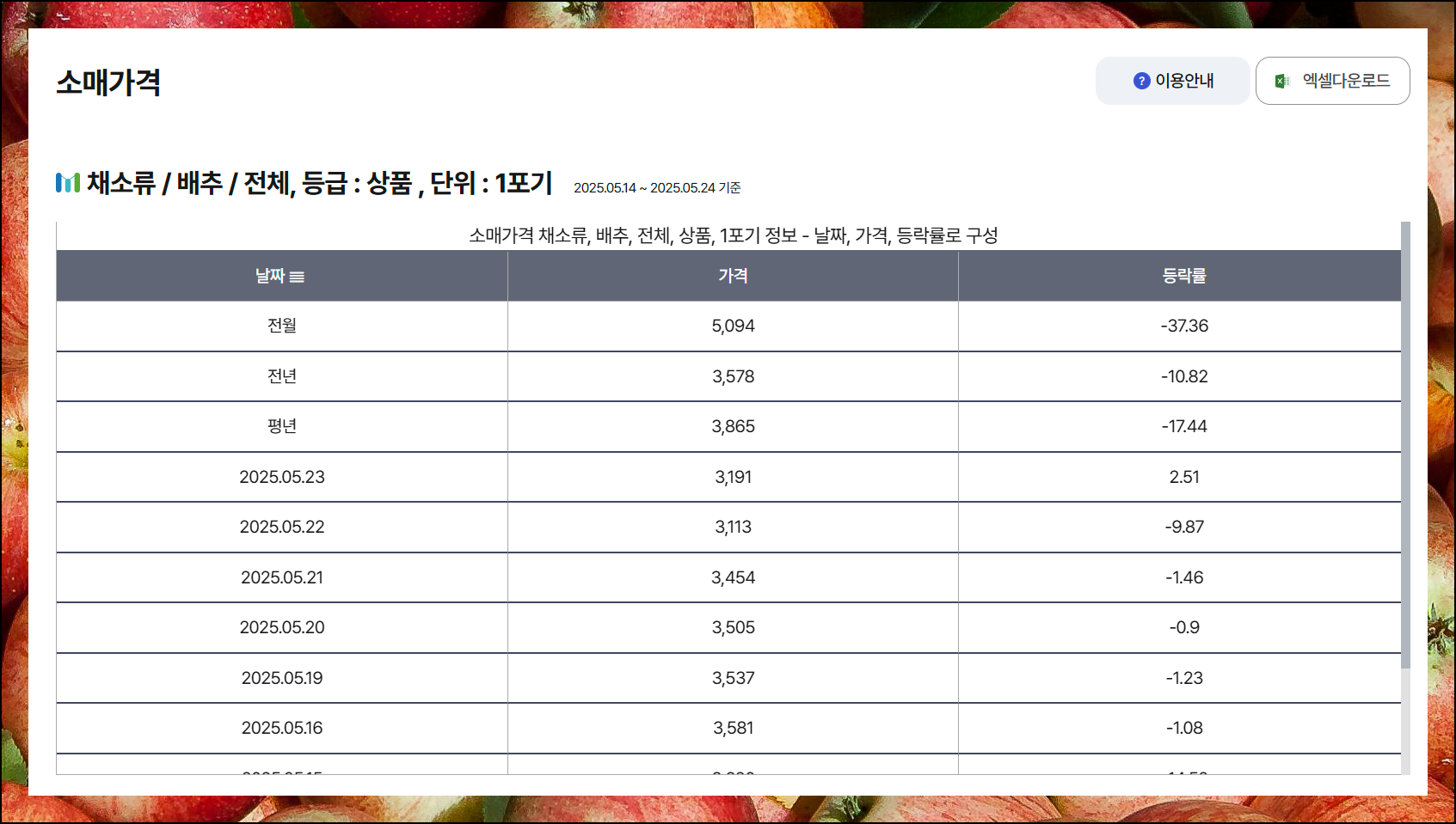 조회 결과는 정리된 표 형태로 제공되요. 평균 금액, 최고가, 최저가, 등락률을 한 번에 확인할 수 있습니다. 당일부터 최근 일주일, 한 달 전, 1년 전, 평년과의 비교도 가능해요. 간단한 표는 기본이고, 우측 상단에 있는 "엑셀 다운로드" 버튼을 누르면 내 마음대로 변형해서 볼 수 있는 데이터에 접근이 가능합니다.
