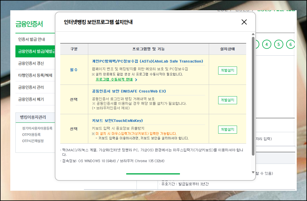 PC 방화벽과 키보드 보안, 그리고 공인인증서 보안 프로그램이에요. 개인정보 보호를 위한 필수 도구들이니 안심하고 설치하시면 돼요.