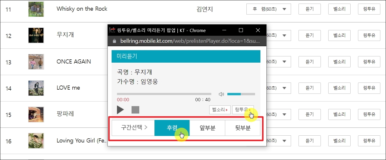 ▼미리듣기 창이 열리면 KT에서 설정할 수 있는 음원을 들어볼 수 있습니다. 후렴, 앞부분, 뒷부분 이렇게 3가지 버전이 있으니 모두 들어보고 가장 마음에 드는 것을 선택하면 됩니다. 너무 마음에 들어서 바로 컬러링으로 사용하고 싶다면 [링투유] 버튼을 누르면 됩니다. 그럼 KT 사이트를 통해 컬러링 바꾸는 서비스 페이지가 열리는데, 안내에 따라 결제까지 진행을 하면 됩니다.